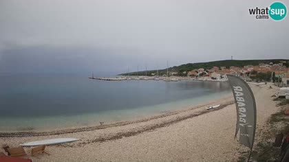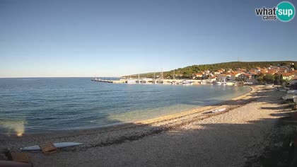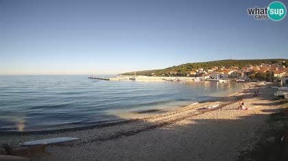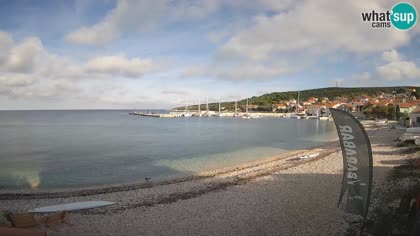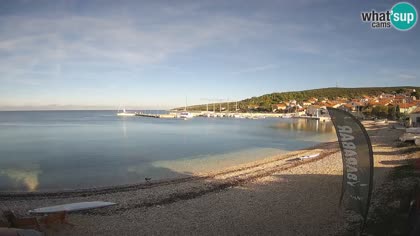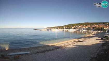 Widok na kamienistą plażę w miejscowości Unije na wyspie o tej samej nazwie. Aktualny obraz z kamery dostępny na zewnętrznej stronie internetowej. Kliknij w miniaturkę, aby go zobaczyć. Kamera przypisana do kategorii Plaże, morza.