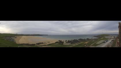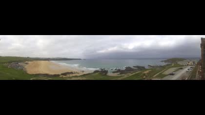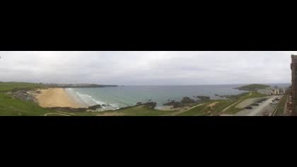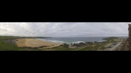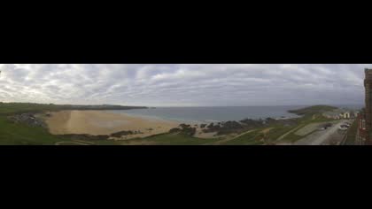 Widok z hotelu The Headland na plażę Fistral w Newquay. Aktualny obraz z kamery dostępny na zewnętrznej stronie internetowej. Kliknij w miniaturkę, aby go zobaczyć. Kamera przypisana do kategorii Plaże, morza.