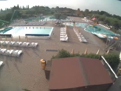 Widok na żywo na park wodny znajdujący się na terenie kempingu Spiaggia D'Oro na południe od Lazise. Aktualny obraz z kamery dostępny na zewnętrznej stronie internetowej. Kliknij w miniaturkę, aby go zobaczyć. Kamera przypisana do kategorii Baseny.